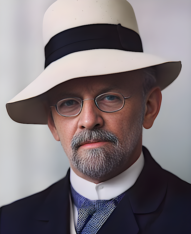 This is the famous German mathematician David Hilbert (1862-1943), arguably the greatest mathematician of the 20th Century. While Einstein was struggling to derive the field equations for his 1915 theory of general relativity, Hilbert, recognizing that his fellow colleague was a brilliant physicist but only a so-so mathematician, derived the field equations using what is now a standard method in gravitational and quantum physics. The technique Hilbert used is known as the Principle of Least Action, and it took him about a minute to derive what it took months for Einstein to accomplish. But Hilbert acknowledged that it was Einstein's theory, so he graciously allowed Einstein to take credit for the derivation, which he finally arrived at about the same time as Hilbert.